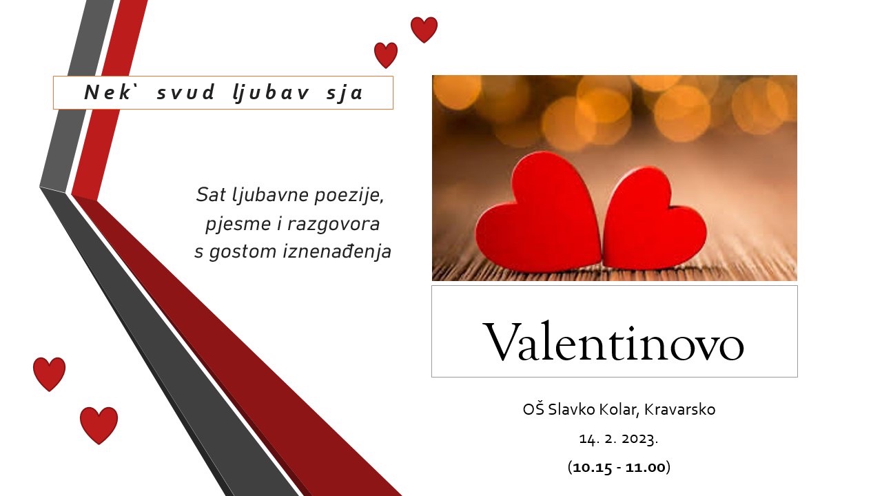 Za Valentinovo u školskom je holu za učenike predmetne nastave održan prigodan sat ljubavne poezije, pjesme i razgovor s gostom iznenađenja. Prvo je knjižničarka uz prezentaciju predstavila sv. Valentina i te razlog populariziranja samog Valentinova. Učenici osmog razreda pročitali su nekoliko pjesama po svojem izboru te otpjevali pjesmu Nek` svud ljubav sja. Osim toga, učenici David Juvan i Petra Klasnić izveli su svoje monodrame kojima su se predstavili na ovogodišnjoj smotri LiDraNo. Gost iznenađenja bio je kolega Leon Levar, profesor Tjelesne i zdravstvene kulture. Odnedavno oženjen, govorio je o ljubavi, o sportu, o svojoj djevojci, sada supruzi te o vrijednostima koje zagovara kao osoba. Učenicima je bilo iznimno zanimljivo poslušati profesora Levara, jer kao što se pokazalo, rijetko imaju priliku s odraslima govoriti o osobnim temama.